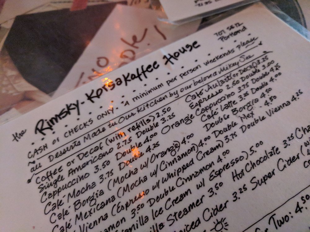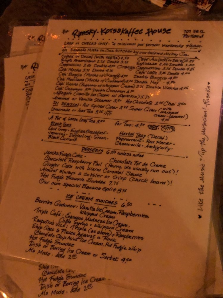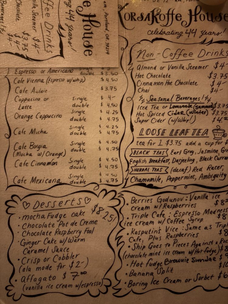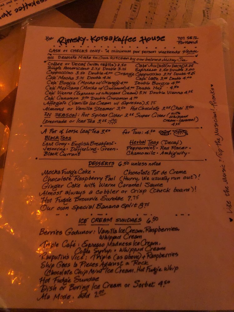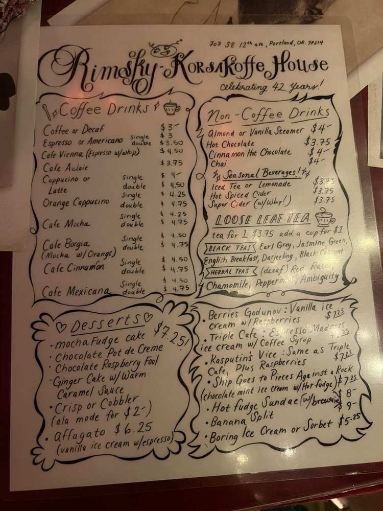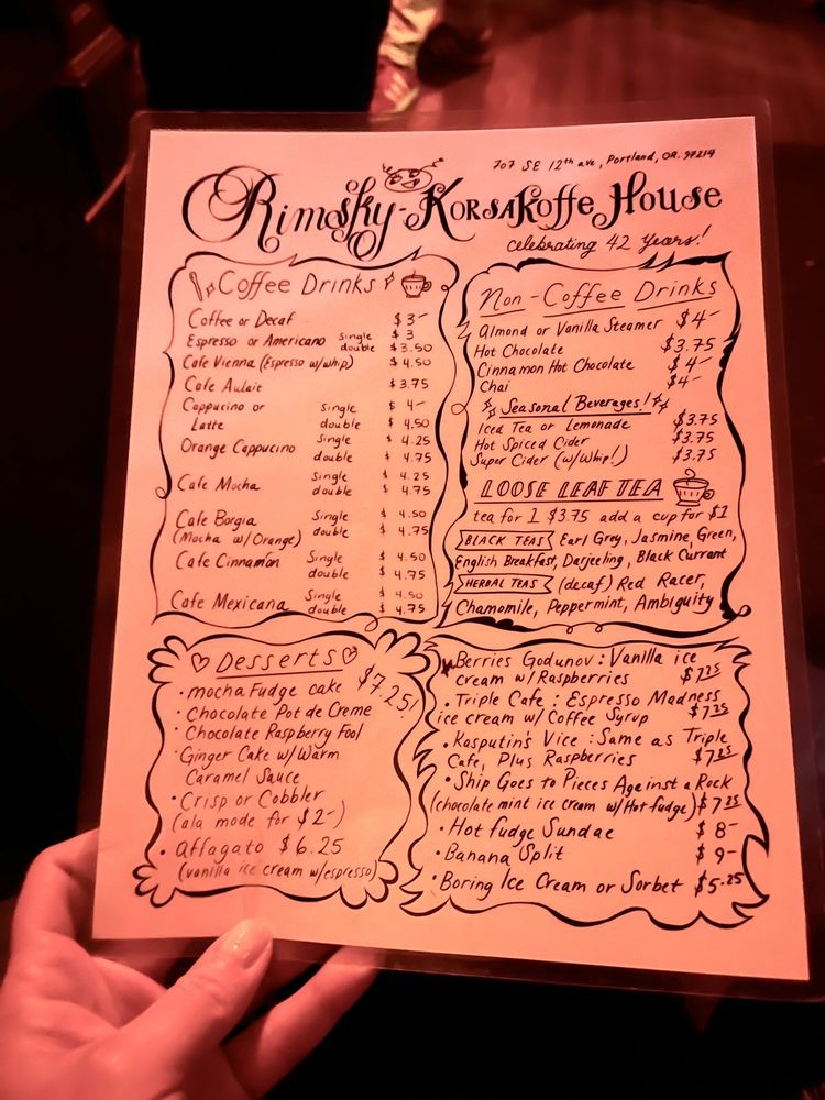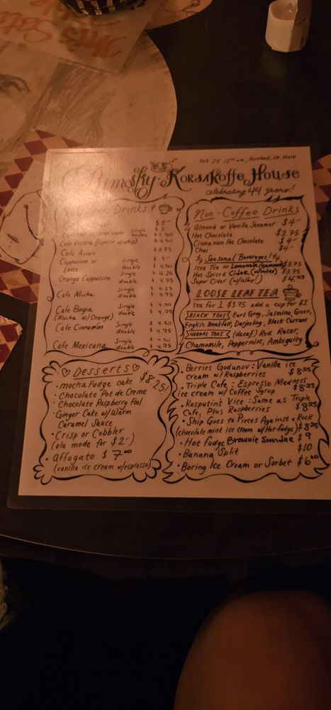 Introducing Rimsky-Korsakoffee House, a dessert haven in Portland where quirky meets delicious. This cozy spot offers a variety of late-night desserts, coffee, and teas in a haunted house setting. The eclectic decor and intimate lighting create a unique ambiance perfect for date nights or catching up with friends. Customer favorites like the Cobbler, Ginger Cake, and Eggnog Latte are not to be missed for their wonderful flavors. The revolving table adds a fun twist but beware if you're prone to vertigo. While the service and wait times can vary, the friendly staff and offbeat charm make Rimsky-Korsakoffee House a must-visit spot for those seeking cool, dark vibes and delectable sweets. Don't miss out on the experience of this hidden gem in Portland.